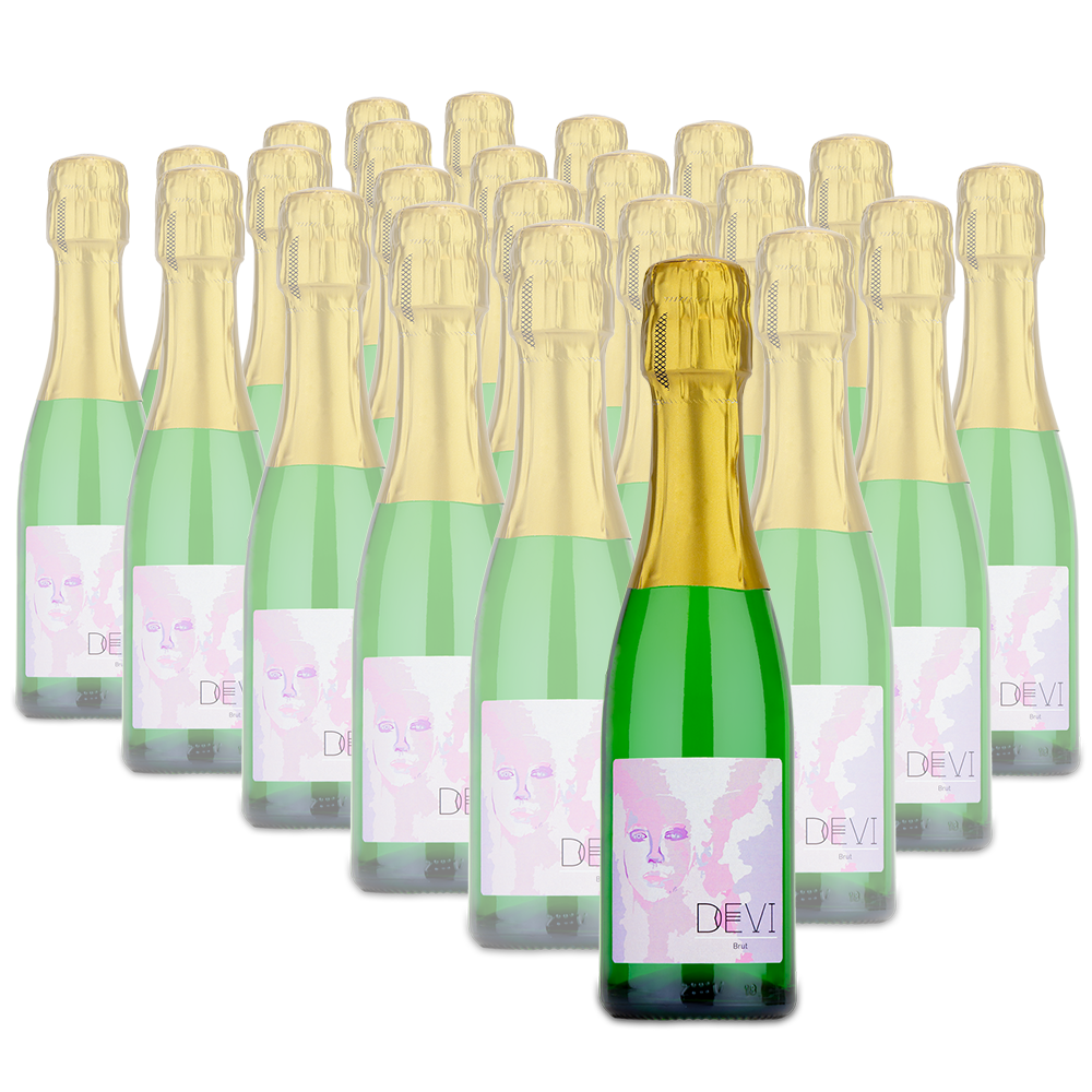 This sparkling brut is a beautiful pale gold in color with delicate bubbles and a bouquet of fresh pear and apple. It has a clean attack, with the small bubbles offering a refreshing zing to the mouthfeel. Devi is very pleasant to the taste thanks to a well-balanced dosage. This bubbly will pair well with most light aperitifs or white meat but goes exceptionally well with fish and seafood. Order a case of Devi mini sparkling wine bottles today.
